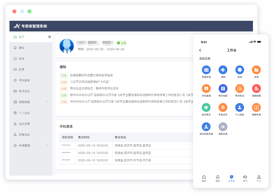主要包括人臉識別、身份驗證、注冊、入庫申請、學習、考試、知識庫、專家證書、信息變更、咨詢、通知、評標邀請、請假銷假、數字證書申請、手寫電子簽名、考評信息、考評異議、續聘申請、資深專家申請、個人信息管理等。
