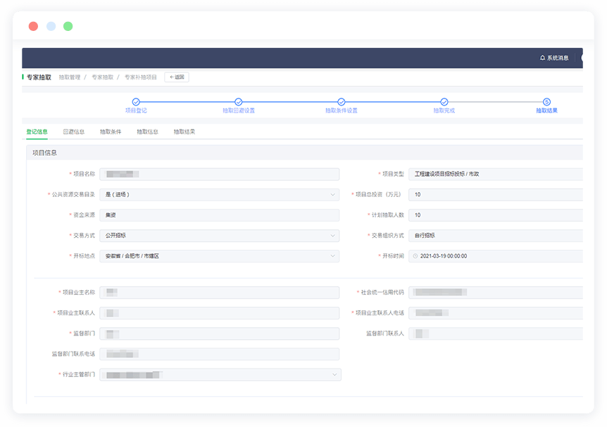 主要包括用戶注冊、抽取登記、回避單位設置、回避專家設置、抽取條件設置(支持專業、地區、行業、職稱、職業資格、是否資深、到達時間等多條件組合)、抽取預約、抽取核驗、語音合成、隨機抽取、智能選取、語音通知、短信通知、手機App通知、遲到催促、抽取結果管理(加密、解密、打印)、專家補抽、項目復評、專家勞務費、稀缺專業統計、抽取監控、抽取統計等。