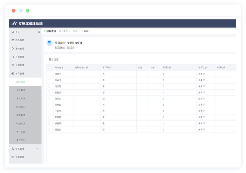 主要包括專家評標活動考評(支持分值、考評指標自定義)、追加考評、系統考評(未接聽、拒絕參評、長期請假)、培訓考評、年度考評、聘期考評、考評異議管理、考評統計等。
